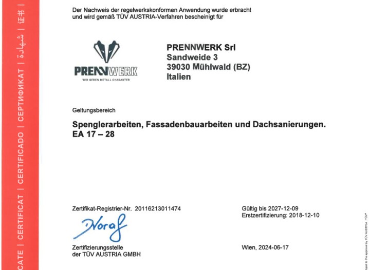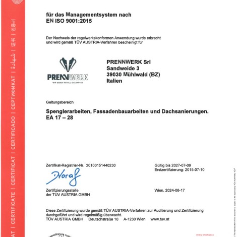 Qualitätsmanagement bezeichnet alle organisatorischen Maßnahmen, die der Verbesserung der Prozessqualität, der Leistungen und damit den Produkten unseres Spenglerei-Unternehmens dienen. Der Begriff „Leistungen“ umfasst im Qualitätsmanagement die Dienstleistungen, geht aber über den üblichen Begriff hinaus und betrifft vor allem die innerorganisatorischen Leistungen. Qualitätsmanagement ist eine Kernaufgabe des Managements des Spenglerei-Fachbetriebes Prennwerk. Die EN ISO 9001:2015 legt die Mindestanforderungen an unser Qualitätsmanagementsystem fest, damit wir Produkte und Dienstleistungen bereitstellen können, welche die Erwartungen unserer Kunden sowie allfällige behördliche Anforderungen erfüllen. Zugleich soll das Managementsystem einem stetigen Verbesserungsprozess der Spenglerei Prennwerk in Mühlwald unterliegen.