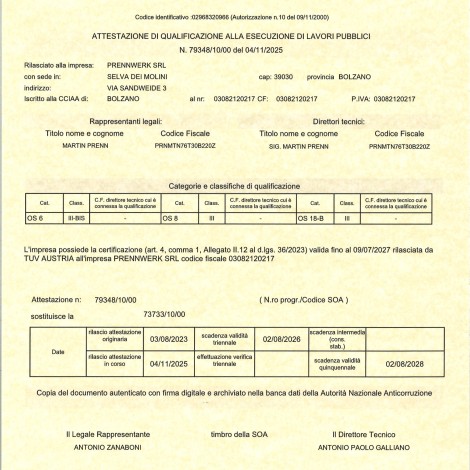 Für Bauaufträge mit einem Auftragswert von über 150.000,00 € ist eine Zertifizierung durch eine akkreditierte Gesellschaft (SOA – Società Organismi di Attestazione) gesetzlich vorgeschrieben. Diese bestätigt die wirtschaftliche, technische und organisatorische Leistungsfähigkeit eines Unternehmens.